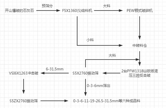 主机设备:PEW颚式破碎机、2台PFW反击破碎机、VSI6X制砂机