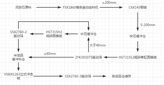 主机设备:C6X颚式破碎机、HST液压圆锥破、VSI6X制砂机等