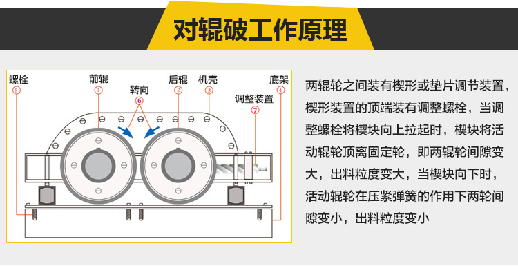 辊式破碎机是利用辊面的摩擦力将物料咬入破碎区,使之承受挤压或劈裂而破碎的机械。当用于粗碎或需要增大破碎比时,常在辊面上做出牙齿或沟槽以增大劈裂作用。