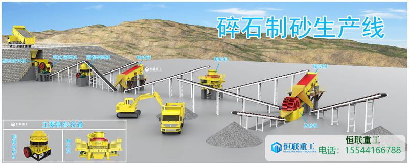 石料由振动给料机均匀地送到鄂式破碎机进行粗破,粗破后的物料由胶带输送机送入到制砂机进行进一步破碎,细碎后的物料被输送到振动筛进行筛分,达到成品粒度要求的物料被送入洗砂机清洗,清洗后由成品输送带输出即为成品;未达到成品粒度要求的物料从振动筛返回制砂机重新加工,形成闭路多次循环。成品粒度可按用户的需求进行组合和分级。如果选用干法生产工艺,可配备粗细粉分离机和除尘设备。