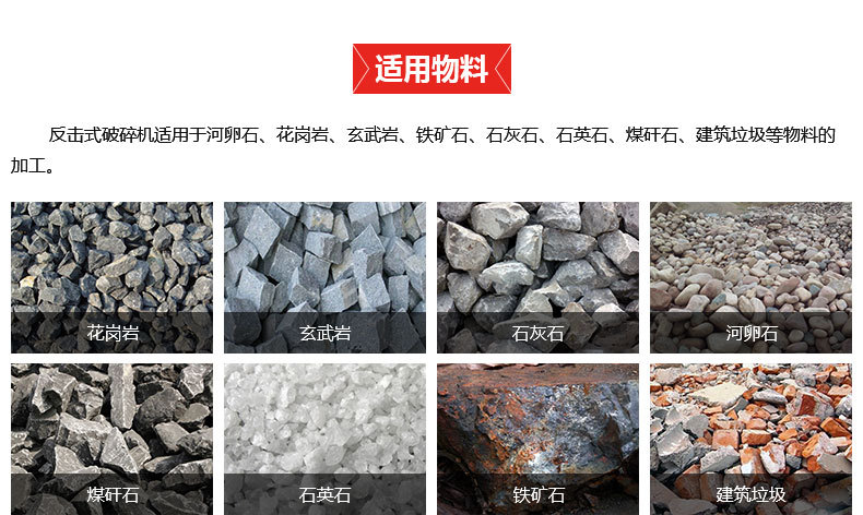 反击式破碎机是顺应市场需求出现一种新型破碎设备,不同于鄂破的挤压式破碎,反击式破碎机是利用冲击能对中等硬度脆性物料进行破碎的设备。PF反击式破碎机是结合自身优势并吸收国内外**技术开发的产品。具有破碎比大、产品粒度均匀且过粉现象少、能耗低、设备制造容易、维护方便、硬岩破碎高效节能、产品粒度调整范围大、排料粒度大小可调、简化破碎流程等优点。反击式破碎机能破碎进料粒度不超过500mm、抗压强度不超过350MPa的多种粗、中、细物料(花岗岩、石灰石、混凝土等),被广泛用于高速公路建设、水利工程和电力工程等领域,具有加工成品成立方体,无张力和裂缝,具有破碎比大、破碎效率高、维修方便等特点。